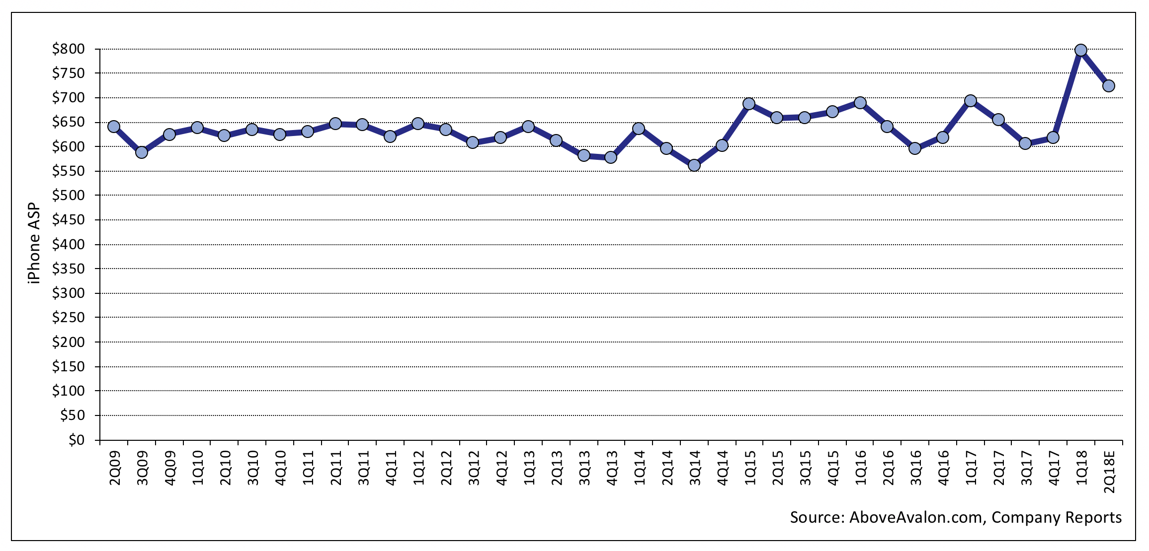 ASP. Similar to iPhone sales growth, iPhone ASP will likely follow this Goldilocks path of not being too hot or cold, but rather following a status quo. As seen in Exhibit 6, after years of remarkable consistency, iPhone ASP hit $796 in 1Q18. Not only was this a record high for iPhone ASP, but the $178 sequential jump in ASP was also a record. The strong results were driven by a perfect storm of the higher-priced iPhone 8 and 8 Plus as well having the iPhone X launch take place in 1Q18.