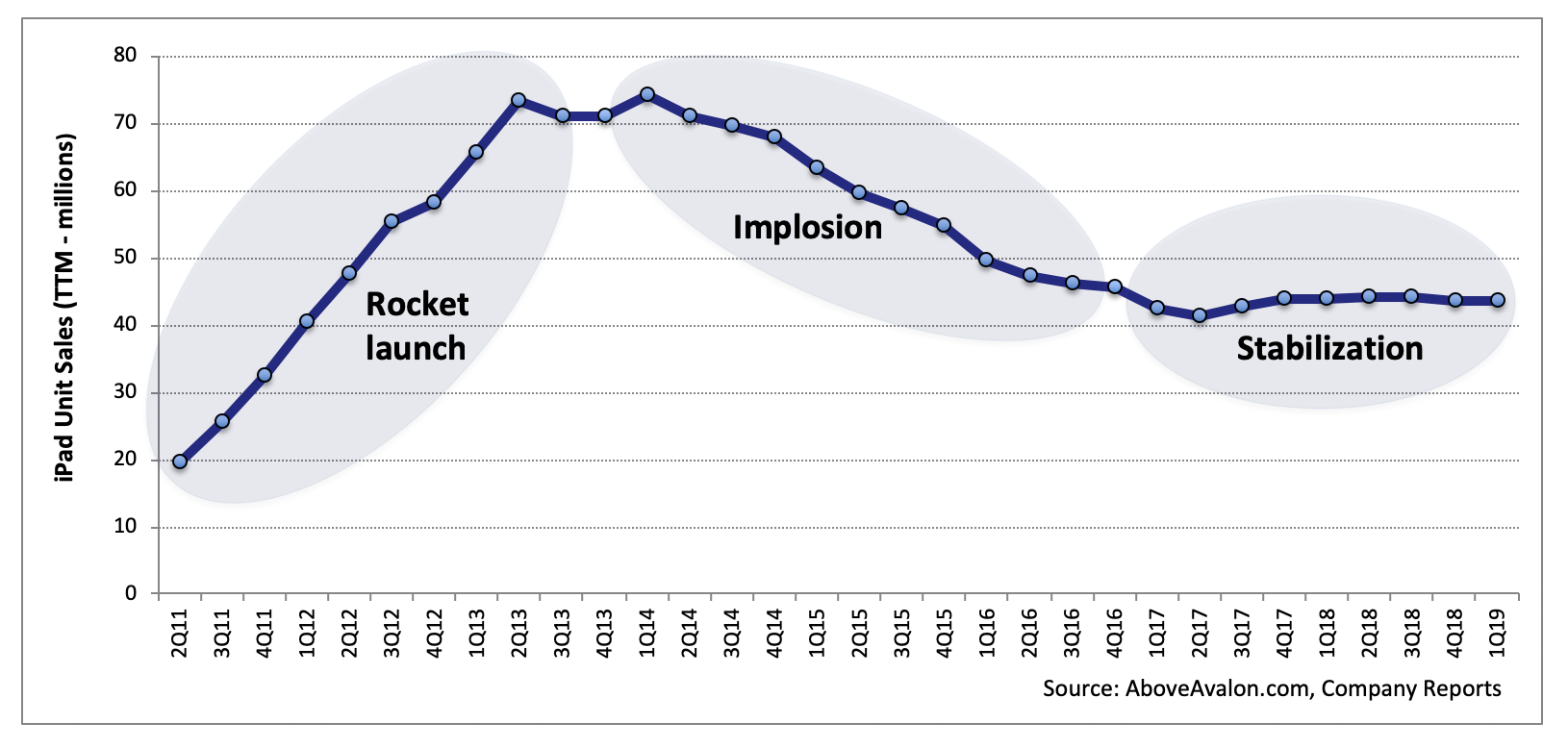 Implosion. iPad sales peaked at the end of 2013 at 74M unit sales on a trailing twelve months (TTM) basis. Three years later, the iPad sales runrate stood at 41M units. Three factors are behind the dramatic decline in sales: less demand for iPad mini, a longer upgrade cycle, and the broader iPad category being cannibalized by more capable iPhones.